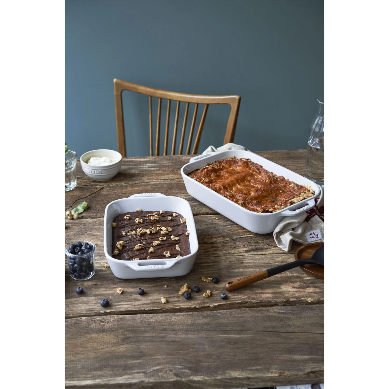 Die rechteckige weiße Auflaufform von Staub hat eine Größe von 34 x 24 cm und besteht aus Keramik. Sie fasst 4,5 l, sodass Sie in ihr einen leckeren Auflauf für die ganze Familie zubereiten und ihn auch elegant in der Form servieren können. Durch ihre ergonomischen Griffe lässt sich diese Auflaufform leicht in den Backofen stellen und wieder herausnehmen. Sie ist außerdem stapelbar, sodass Sie mehrere Formen platzsparend in einem Schrank in Ihrer Küche verstauen können. Mit der weißen Auflaufform von Staub begeistern Sie Ihre ganze Familie mit vielseitigen Ofengerichten.