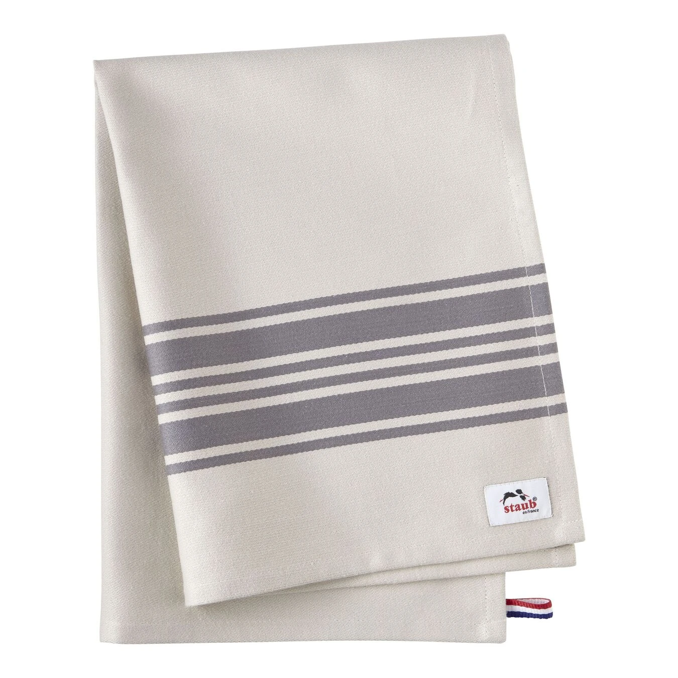 Praktisch, hochwertig und in edlem Design: das neue STAUB Küchenhandtuch erfüllt alle Kriterien, die gute Kochutensilien ausmachen. STAUB typisch ist auch die hochwertige Verarbeitung für größtmögliche Funktionalität und lange Lebensdauer. Beides wird durch einen Stoff aus 100 % Baumwolle mit hoher Saugfähigkeit, umgenähten Säumen an allen vier Seiten und einem fest vernähten Aufhänger gewährleistet. Mit den Maßen 50 x 70 cm ist das Küchenhandtuch für alle Aufgaben von Abtrocknen bis Polieren ideal geeignet und als wichtiges Helferlein unentbehrlich. Neben der Funktion spielt auch der optische Auftritt in jeder anspruchsvollen Küche eine wichtige Rolle. Entsprechend ist das zeitlose Design mit grauen Streifen auf dem naturweißen Stoff in jeder Umgebung ein stilvolles, dekoratives Element. Noch mehr schöne Details sind das dezente Etikett mit STAUB Logo und das kleine Fähnchen in den Farben der französischen Tricolore – jeweils weltweit anerkannte Markenzeichen außergewöhnlicher Kochkunst.