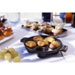 Das runde, schwarze Fondue Set aus der Reihe Staub Spezialitäten wurde speziell für Schokofondues entwickelt. Mit ihm gelingt Ihnen daher ein außergewöhnliches Dessert, mit dem Sie Ihre Familie oder Ihre Gäste überraschen. Dieses Set können Sie aber auch für andere Zwecke wie beispielsweise für ein Käsefondue verwenden. Sein Topf besteht aus Gusseisen und kann deshalb mit jedem beliebigen Inhalt gefüllt werden. Der Topf des schwarzen Staub-Fondue Sets hat einen Durchmesser von 10 cm, ist 7 cm hoch und hat ein Fassungsvermögen von 0,25 l. Sie können ihn auf jedem Kochfeld – auch Induktionsfeldern –benutzen. Dieses Set ist mit vier an den Griffenden farbig markierten Gabeln ausgestattet und eignet sich daher ideal für kleine Runden. Klein geschnittenes Obst, das in heiße Schokolade getaucht wird, ist eine Köstlichkeit, die fast jedem schmeckt. Gusseisen hat eine sehr gute Wärmespeicherfähigkeit und hält Schokolade lange warm. Mit dem Fondue Set von Staub auf dem Tisch begeistern Sie Ihre Gäste mit einem ausgefallenen Nachtisch in gemütlicher Runde.
