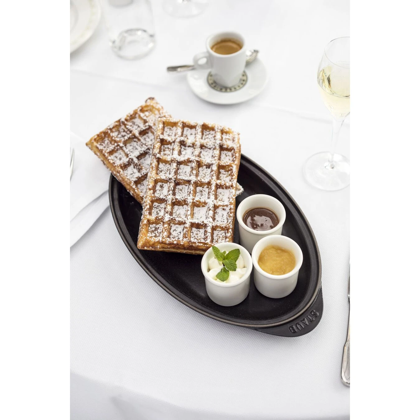 Frischer Fisch aus dem Ofen direkt auf den Tisch: In der gusseisernen Fischplatte mit Deckel aus der Serie Sur la Table Minis von Staub können Sie ganze Fische schonend und schmackhaft zubereiten sowie anschließend ansprechend auf der Tafel präsentieren. Denn mit dem ovalen, eleganten Design in Schwarz setzen Sie Ihre Fischgerichte stilvoll in Szene. Die Fischplatte mit einem Fassungsvermögen von 0,7 l überzeugt optisch durch Ihren auffälligen Messingknauf am Deckel. Der Deckel ist zudem mit kleinen Noppen ausgestattet, sodass anfallendes Kondenswasser zurück auf den Fisch tropft. Dadurch bleibt dieser beim Garen saftig und die Aromen können sich voll entfalten. Insgesamt hat die Platte eine Länge von 36 cm, eine Höhe von 8,4 cm und eine Breite von 20 cm. Wie das übrige Kochgeschirr von Staub besticht auch diese ovale Fischplatte durch eine moderne Interpretation klassischen französischen Küchendesigns. Das Material ist robust und leicht zu reinigen. So bereiten Sie unkompliziert frischen Fisch für Freunde und die Familie zu und präsentieren diesen stilecht.