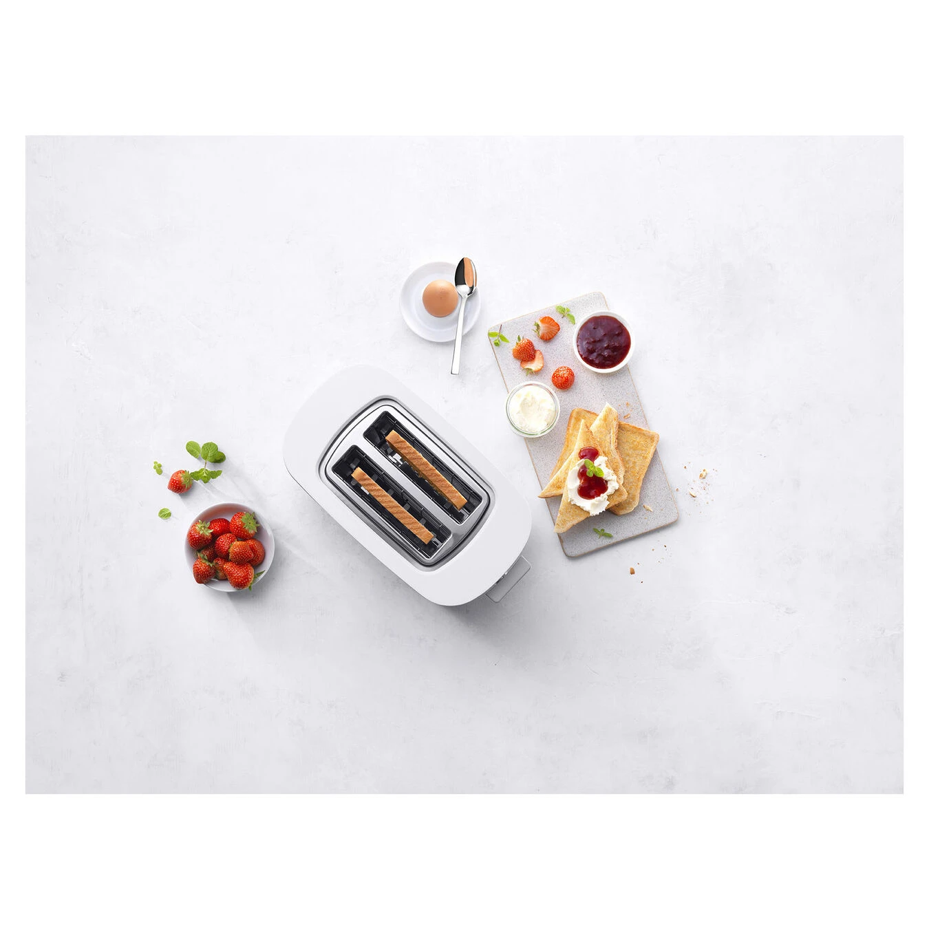 Genießen Sie Ihren Toast, so wie Sie ihn am liebsten haben. Jedes Mal. Der hochwertige ZWILLING Toaster für 2 Brotscheiben im modernen Design sorgt auch bei mehreren Toastvorgängen für eine immer gleichbleibende Bräunung der Toastscheiben. Dafür verkürzt er automatisch die Röstdauer, um die eingestellte Bräunung zu erreichen. Durch die 4 separaten Heizelemente des 1000-Watt-Toasters wird jeder Toast gleichmäßig auf beiden Seiten gebräunt. Das Ergebnis ist außen knusprig und innen noch weich – ein echter ZWILLING Toast. Fertige Toasts fliegen nicht aus dem Toaster. Die Toastscheiben gleiten dank Soft-Lift-Funktion sanft nach oben und mit der integrierten Nachhebefunktion können auch kleinere Scheiben bequem aus dem Toaster gehoben werden. Die Toasts können nicht verbrennen: Der Toaster schaltet sich nach der eingestellten Röstdauer automatisch ab. Selbst auf der höchsten Stufe werden die Toasts maximal dunkelbraun. Mit der Stopp-Taste kann jeder Vorgang sofort abgebrochen werden. Krümel landen in der einfach herausnehmbaren Krümelschublade. Neben 7 Bräunungsstufen verfügt der Toaster über 3 Automatikprogramme. Mit der Aufwärmfunktion kann kalt gewordener Toast wieder aufgewärmt werden. Die Auftaufunktion erlaubt das direkte Toasten von gefrorenem Toast. Und die Bagelfunktion mit Brotscheibenzentrierung ermöglicht ideale Bagel-Toastergebnisse – innen geröstet und außen knusprig. Mit dem abnehmbaren Brötchenaufsatz können zusätzlich 2 Brötchen aufgewärmt oder getoastet werden. Darüber hinaus kann der Brötchenaufsatz dank symmetrisch angeordneter Querstreben auch ideal als Servierteller für Ihre Toasts verwendet werden.